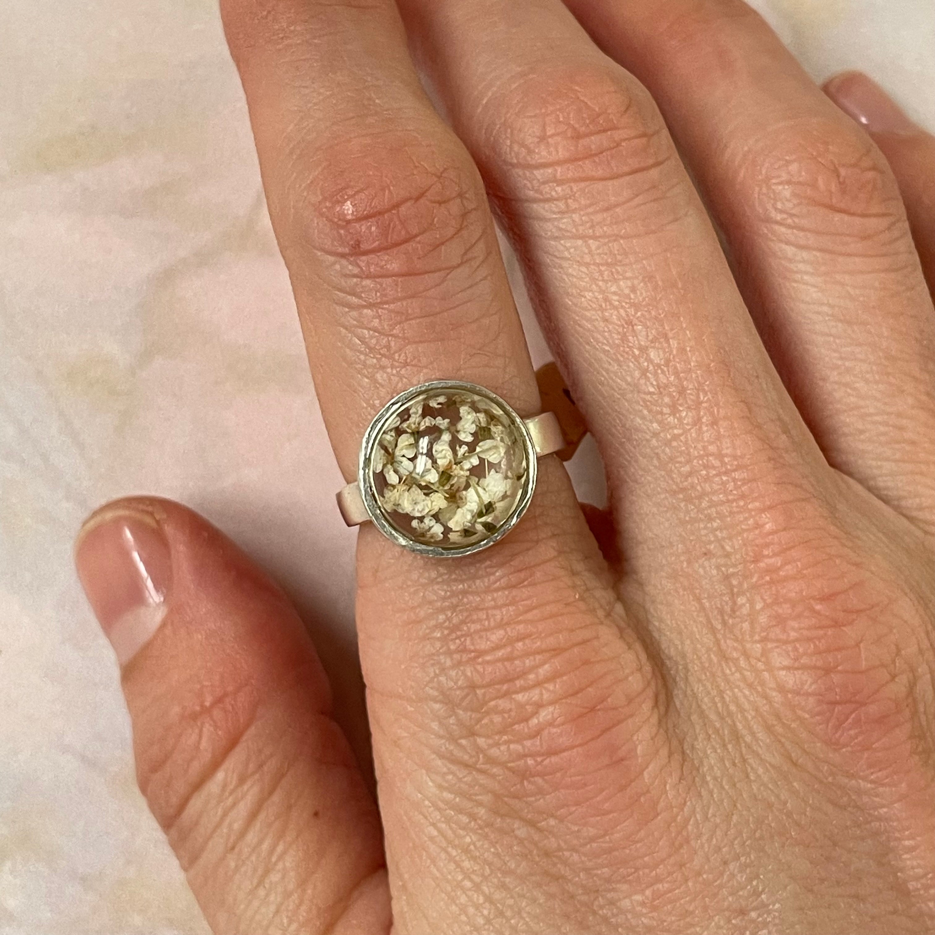 • Piedra en resina y flores prensadas y base en plata 9/25 .